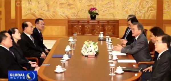 Buổi gặp hiếm hoi này bắt đầu từ 11 giờ sáng và kết thúc lúc 1:46 pm, với sự tham gia của bốn quan chức Triều Tiên tới tham dự lễ khai mạc Thế vận hội, trong đó có em gái của nhà lãnh đạo Triều Tiên Kim Jong-un, bà Kim Yo-jong.