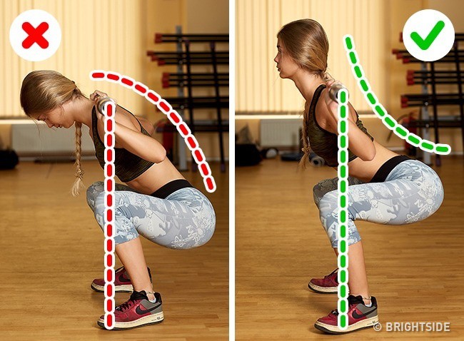 Đúng: Hãy giữ cho lưng thẳng, đẩy xương chậu ra đằng sau. Đảm bảo rằng, đầu gối được uốn cong ở góc 90 độ khi ngồi xổm.