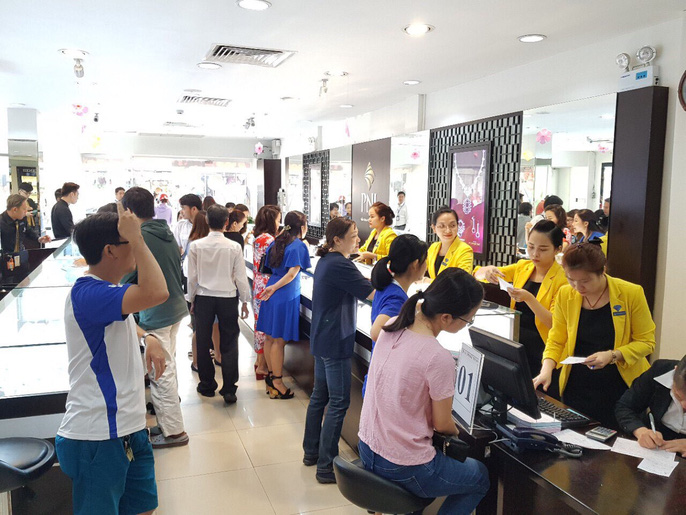 Đến khoảng 9 giờ 30, nhiều cửa hàng vàng tại TP mới đông nghẹt khách, nhiều khách hàng phải xếp hàng chờ tới lượt để mua vàng cầu may.