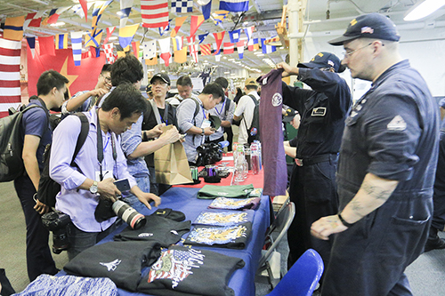 Khách tham quan mua đồ lưu niệm trên tàu sân bay.