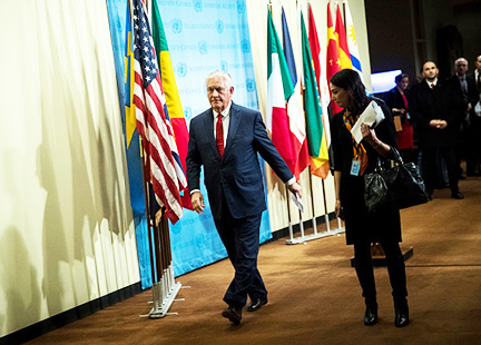 Ngoại Trưởng Rex Tillerson rời phòng họp của Hội Đồng Bảo An Liên Hiệp Quốc, sau khi đưa ra những biện pháp chế tài đối với Bắc Hàn trong tháng 12, 2017. (Drew Angerer/ Getty Images)