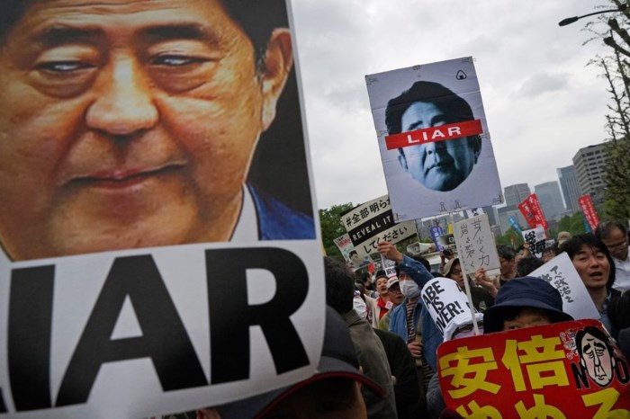 Bloomberg dẫn lời các nhà tổ chức cho biết có khoảng 50.000 người đã tham gia cuộc biểu tình ở Tokyo hôm 14/4, cuộc biểu tình lớn nhất trong gần 3 năm. Người biểu tình, trong đó có rất nhiều thanh niên, giương cao biểu ngữ gọi ông Abe là "kẻ nói dối" và yêu cầu ông từ chức.