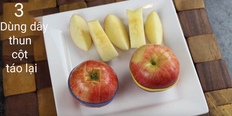 Sau khi cắt xong, chị ghép những miếng đã cắt lại thành hình quả táo như ban đầu, rồi dùng sợi thun cột chặt lại. Chị nói, chỉ với một sợi dây thun nhỏ xíu là chị đã có thể giữ quả táo cả ngày mà không bị thâm đen.
