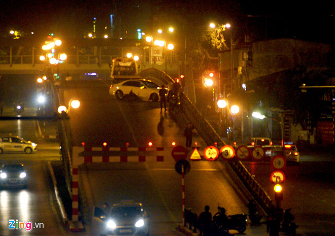 Tại hiện trường, ôtô sau tai nạn nằm chắn ngang toàn bộ làn đường hướng Ngã Tư Sở đi Tây Sơn, chiếc xe bị hư hỏng nặng phần đầu. Xe máy cũng bị hư hỏng, biến dạng, dải lan can thành cầu trở nên méo mó, nhiều mảnh vỡ của 2 xe và thành cầu vương vãi khắp nơi, rơi cả xuống chân cầu.