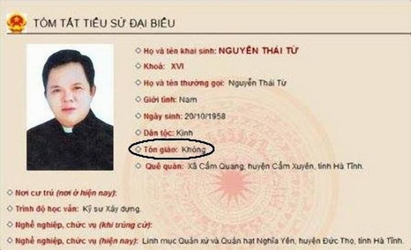 Cách đây mấy năm, trang thông tin của Hội đồng Nhân dân Tỉnh Hà Tĩnh đăng Tiểu sử của linh mục Nguyễn Thái Từ, đại biểu Hội đồng nhân dân Tỉnh khóa 16 như sau: