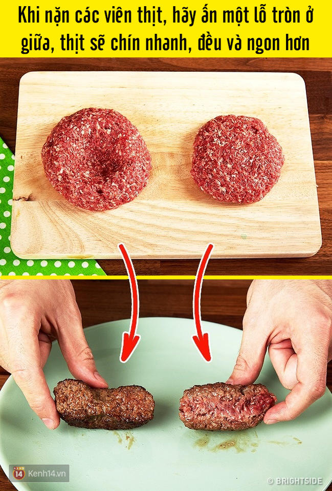Ai hay nướng thịt chắc chắn từng gặp tình trạng miếng thịt bị sống ở giữa nếu chưa nướng kỹ. Để tránh tình trạng này, khi nặn các viên thịt hãy ấn một lỗ tròn ở giữa, thịt sẽ chín đều và nhanh hơn.