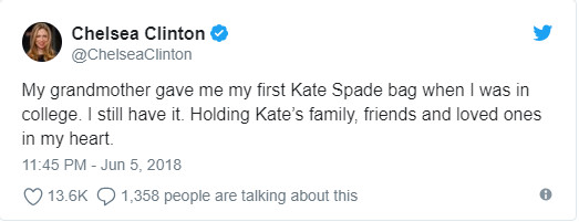 Cô Chelsea Clinton, con gái cựu Tổng thống Mỹ Bill Clinton, than thở: "Bà của tôi đã mua cho tôi một chiếc túi Kate Spade khi tôi còn học đại học. Xin chia buồn với gia đình và bạn bè của Kate".