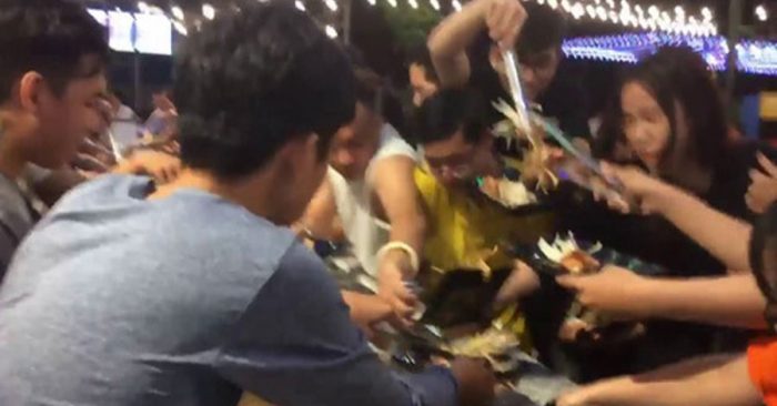 Khi nhân viên vừa phục vụ đồ ăn xuống, nhiều người chen lấn, dùng kẹp gắp lấy gắp để thức ăn về đĩa của mình. Lúc này MC nhà hàng phải dùng loa đề nghị mọi người trật tự, xếp hàng để lấy thức ăn. "Nếu quý khách mất trật tự, nhân viên của chúng thôi sẽ ngưng phục vụ thức ăn cho quý vị. Mong quý khách thông cảm, ai cũng sẽ có phần hết. Quý vị hãy trật tự, về chỗ ngồi, để chúng tôi di chuyển thức ăn ra phía bên ngoài, phục vụ quý vị một cách tốt hơn. Cảm ơn quý vị rất nhiều". Tuy nhiên những thông báo này vẫn bị bỏ ngoài tai.