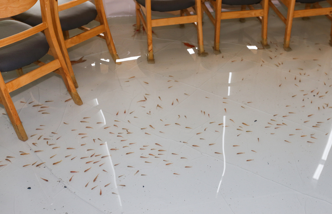 Mực nước trong quán chỉ quá mắt cá chân và luôn được thay nước mỗi lần một ngày. Những con cá chép màu sắc sặc sỡ bơi lội khắp quán nhưng thường tụ tập vào góc tường, chân bàn ghế khi có người.