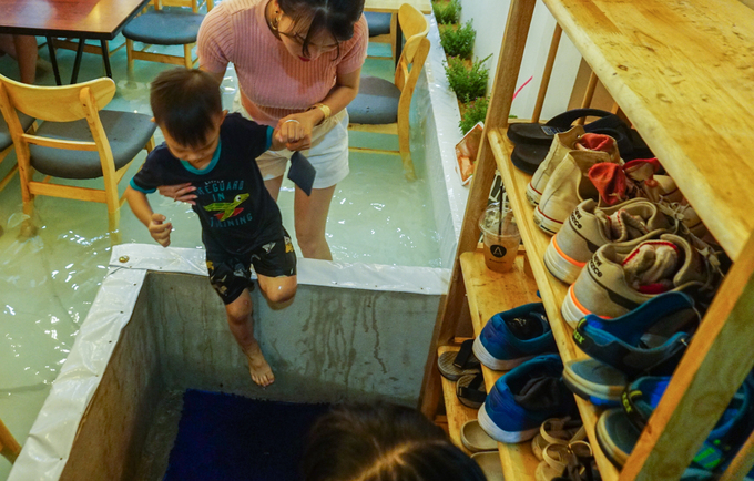Chủ quán xây vách cao khoảng 40 cm, thiết kế hệ thống máy bơm, chống thấm, lọc nước để tạo thành bể nước. Khách khi vào quán đều phải bỏ giày dép ở bên ngoài.