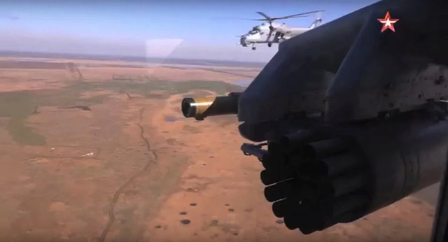 Trực thăng quân sự Nga chuẩn bị bắn rocket S-80FP (Ảnh: Zvezda)