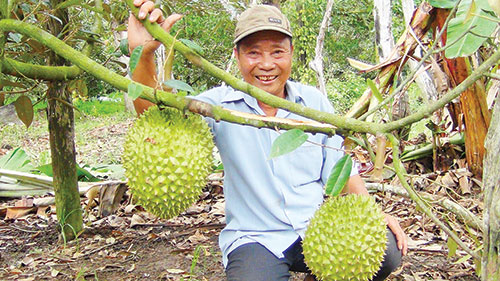Vườn sầu riêng của ông Trần Đình Thanh. Ông Thanh hiện rất phấn khởi với mô hình trồng vườn cây ăn trái cho khách du lịch vô hái, nói không với thương lái.