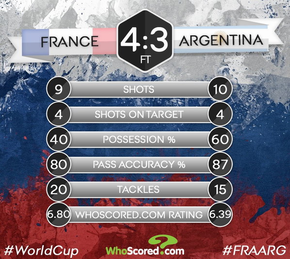 Lần cuối cùng đội bóng Nam Mỹ đánh bại Pháp tại một kỳ World Cup là hồi 1978 (Argentina). Kể từ đó đến nay, Pháp bất bại ở 8 lần chạm trán các đại diện thuộc Nam Mỹ. Tuy nhiên bóng đá luôn ẩn chứa bất ngờ, mạnh như Đức cuối cùng lại thua tức tưởi 2-0 trước Hàn Quốc, một trong những đội yếu nhất giải. Có lẽ điều này ông bầu Pháp Deschamps là người hiểu rõ nhất, bởi vậy không thể coi thường đội Argentina. Kylian Mbappe cần thêm 1 bàn thắng nữa để trở thành cầu thủ tuổi teen đầu tiên có 2 pha lập công tại World Cup, sau Michael Owen năm 1998.
