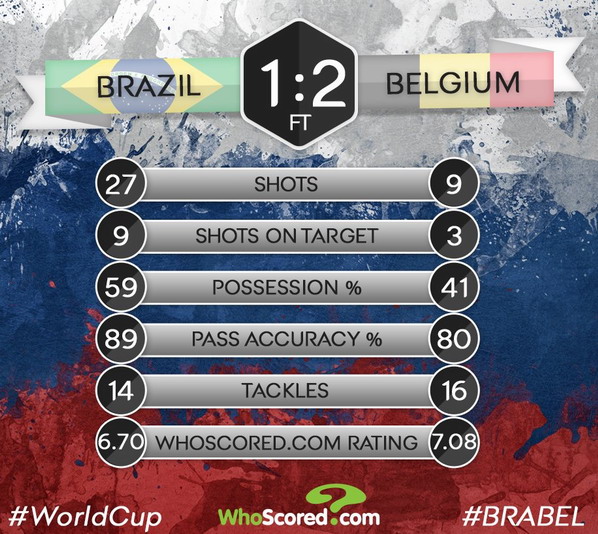 Trận tứ kết thứ hai World Cup giữa Brazil và Bỉ sắp diễn ra. Đây có thể nói là trận đấu được mong đợi nhất vòng tứ kết. Bỉ đã vào tứ kết sau khi thắng Nhật trong trận cầu đầy kịch tính. Nhật đã dẫn trước 2 bàn. Và Bỉ đã gỡ hòa, và phút bù giờ cuối 90+4 Bỉ đã thắng Nhật bằng phản công nhanh.