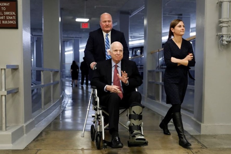 Thượng nghị sĩ John McCain đến phòng họp Thượng viện bỏ phiếu ngày 6.12.2017. Ảnh: Reuters