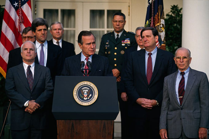 Thượng nghị sĩ John McCain, Thượng nghị sĩ John Kerry, Tổng thống George Bush, tướng Colin Powell và tướng John Vessey tham dự một cuộc họp báo về những người lính mất tích trong chiến tranh tại Việt Nam. Ảnh: Sygma.