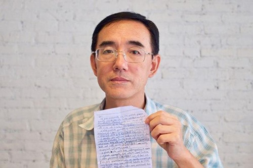 Ông Tôn Nghị và bức thư ông viết khi còn là tù nhân ở trại lao động cưỡng bức Mã Tam Gia. (Ảnh: Minghui)