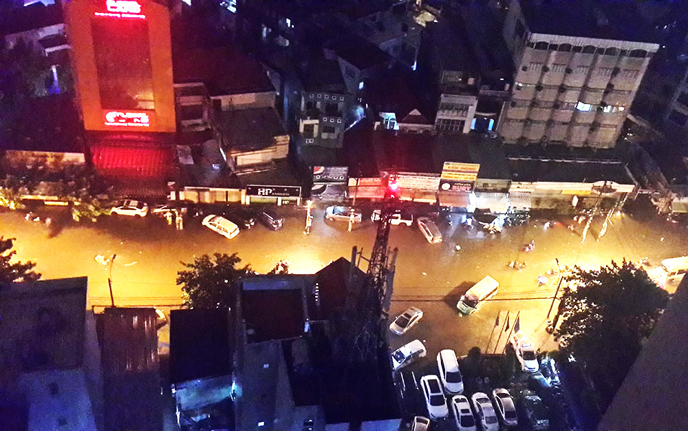 Khuya 25/11, cơn mưa nặng hạt vẫn tiếp tục kéo dài tại TP.HCM khiến toàn TP.HCM chìm trong biển nước. (Ảnh FB: Trung Kien Doan).