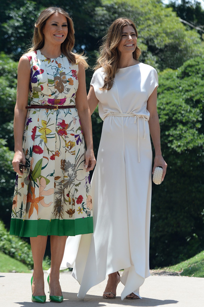 Trong dịp này, bà Melania chọn chiếc váy có họa tiết in hoa và phần chân váy là một dải màu xanh ngọc lục bảo, trong khi đó đệ nhất phu nhân Argentinian cũng tuyệt đẹp trong chiếc váy dài phong cách Grecian màu trắng.