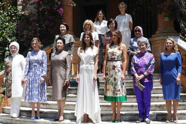 Phu nhân Hà Tinh (quần áo màu xanh) chụp ảnh lưu niệm cùng phu nhân các nguyên thủ tới Argentina dự hội nghị G20. (Ảnh: Reuters)