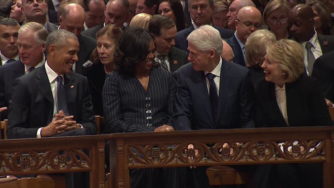 Sự hiện diện của tổng thống Mỹ đương nhiệm Donald Trump tại tang lễ của cựu tổng thống George H. W. Bush dường như đã "phá hỏng" bầu không khí của các tổng thống đảng Dân chủ cùng các cựu đệ nhất phu nhân - những người cười nói và trò chuyện chỉ ít phút trước đó.