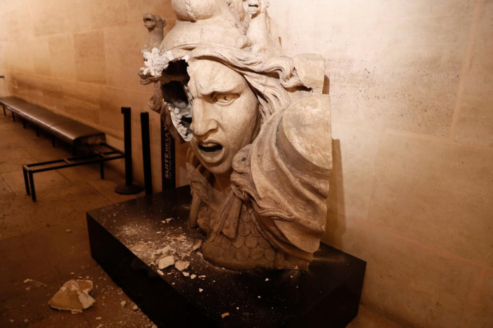 Bức tượng Marianne - biểu tượng của nước Cộng hòa Pháp, bị phá hoại bên trong Khải Hoàn Môn. (Ảnh: Etienne Laurent / EPA)