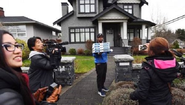 Sau đó, nhân viên giao hàng đưa 4 chiếc pizza cho các phóng viên. (Ảnh:Globalnews)