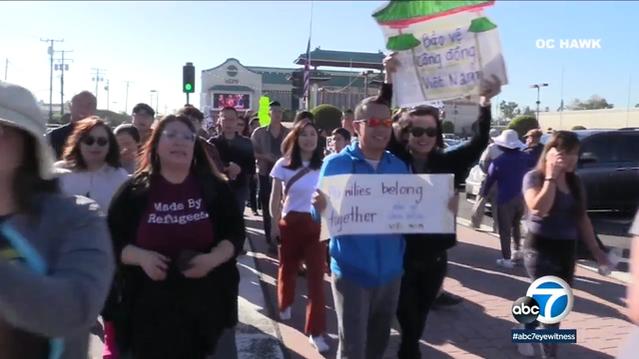 Những người chống ý định của Tổng thống Donald Trump về việc sẽ trục xuất người Mỹ gốc Việt tuần hành qua khu Little Saigon (Ảnh: ABC)