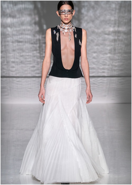 Show diễn của Givenchy bắt đầu với áo khoác đen nhấn vào eo và vạt chéo trắng lệch một bên cùng quần legging da bóng.