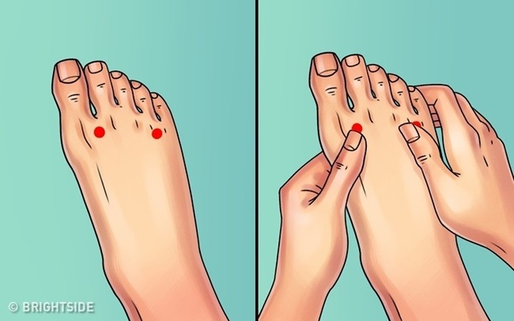 Mát-xa bàn chân: Sau một ngày dài, bạn trở về nhà với đôi chân đau nhức và hai bàn mỏi nhừ, hãy đùng hai ngón tay cái bấm vào các vị trí ở giữa ngón chân cái với ngón thứ hai và giữa ngón chân thứ tư với ngón út (như hình). Bạn bấm sâu ngón tay và day nhẹ nhàng trong 15 phút, để giúp bàn chân được thả lỏng.