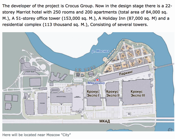 Kế hoạch ban đầu bắt đầu từ năm 2013. Đối tác phát triển, gia đình Agalarov đã xác nhận Crocus City là địa điểm của Tháp Trump vào cuối năm 2015. Người đồng sáng lập Liên minh Dân chủ Scott Dworkin đã khám phá ra vào ngày 3 tháng 7 năm 2015. Emin Agalarov có thuộc hạ thân tín là Rob Goldstone nói với các phóng viên TASS rằng thỏa thuận bất động sản sẽ tồn tại trong chiến dịch chính trị (Trump):" Mặc dù Donald Trump ở thế khó, nhưng ông ấy vẫn quan tâm đến dự án này. Chúng tôi đang trong quá trình đàm phán, nhưng do thực tế là Trump được đề cử làm tổng thống nên kế hoạch của chúng tôi liên tục được điều chỉnh. Mặc dù dự án này được triển khai (dưới thương hiệu Trump Tower) với sự tham gia của một tỷ phú người Mỹ liên quan đến việc cung cấp thương hiệu và công nghệ cho cơ sở. Tập đoàn Crocus sẽ vẫn được toàn quyền điều hành". Ông Trump đã tham gia chiến dịch chính của đảng Cộng hòa hai tuần trước đó, vào ngày 16 tháng 6 năm 2015.