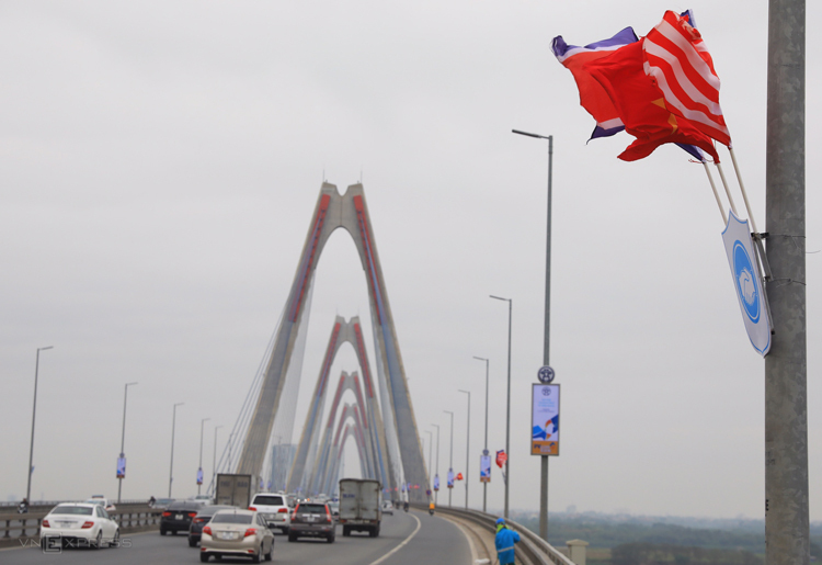 Quốc kỳ Mỹ và Triều Tiên treo hai bên cầu Nhật Tân. Ảnh: Hữu Khoa.