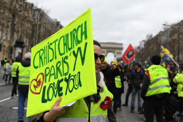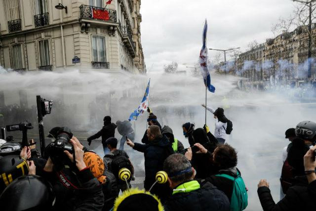 Cuộc biểu tình của làn sóng "áo khoác vàng" ngày 16/3 được đặt tên là "Hành động thứ 18 - Tối hậu thư - Toàn thể nước Pháp trong lòng Paris". Người biểu tình bày tỏ bức xúc rằng những thông điệp từ ngày đầu tiên, kêu gọi bình đẳng kinh tế và xã hội, chăm lo nhiều hơn cho đời sống của tầng lớp bình dân vẫn không được lắng nghe. Thay vào đó, chính quyền chỉ đáp trả bằng vũ lực. Ảnh: AFP.