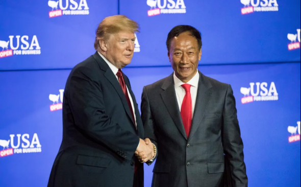 Chủ Tịch Foxconn Quách Thái Minh (doanh nhân Đài Loan) và Tổng thống Hoa Kỳ Donald Trump. Tại Chương trình USA Open for Business, ông Quách đã kể lại quá trình khởi nghiệp từ đơn đặt hàng của một công ty ở Trung Tây 44 năm trước đã giúp ông bắt đầu công ty như thế nào.(Ảnh: chụp từ video của
