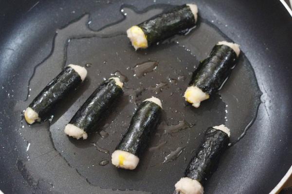 Cuối cùng, đun nóng dầu ăn trong chảo sau đó lần lượt cho từng miếng rong biển đã cuộn vào chiên đến khi gà chín vàng đều là được.