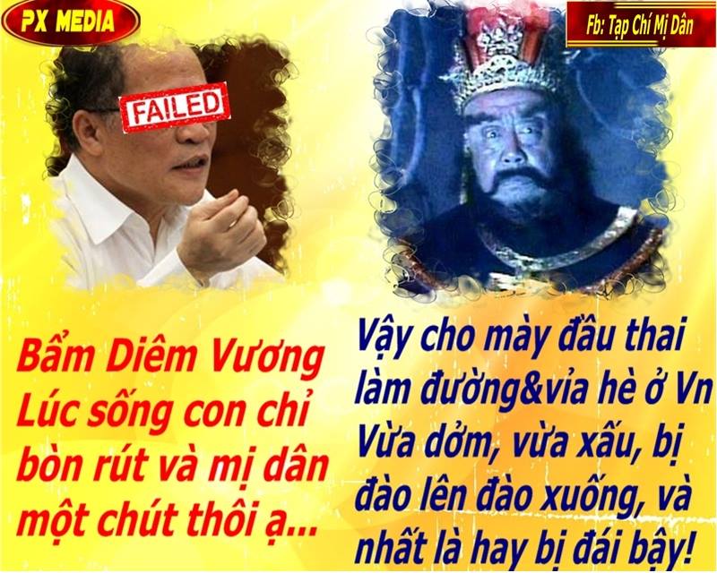 – Nói như ông rứa thì ổn định cái con mẹ gì mà báo chí ngày nào cũng ra rả Đất Nước ta ổn định? Hoà bình mà chết mỗi ngày vài ba trăm mạng ngon ơ. Đấy là chưa nói đến những cái chết lãng nhách như chém giết lẫn nhau, côn đồ truy sát, tự tử ở đồn công an, tự thiêu vì không có vịệc làm, nhãy sông nhãy suối vì bị cưỡng chế…