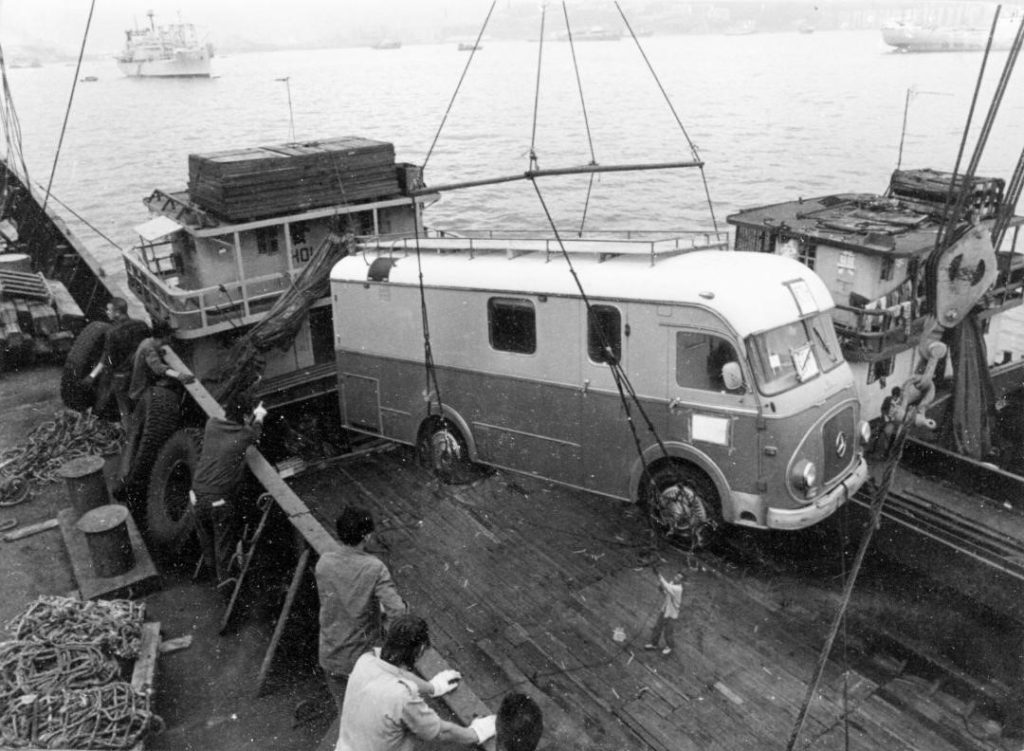 Một trong 3 xe truyền hình lưu động do IK tặng đang được bốc dỡ tại bến cảng Hải Phòng