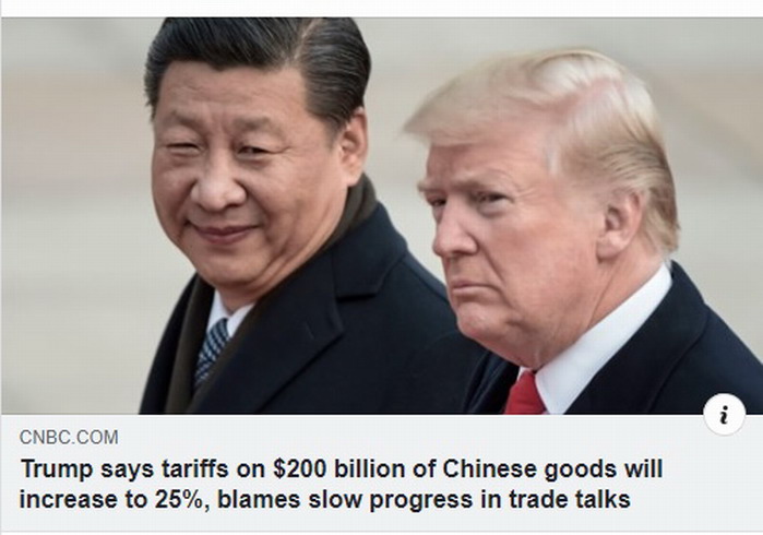 Tin nóng: chúng tôi sẽ tăng thuế lên 25 % đối với hàng 200 tỷ đô la của Trung Quốc vào tuần tới và lên tất cả các hàng hóa trung quốc khác (325 tỷ) cũng sẽ bị đánh thuế sớm.