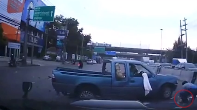 Đoạn video được đăng tải trên trang chia sẻ video LiveLeak. Vụ việc kinh hoàng xảy ra trên một con phố ở tỉnh Nonthaburi (Thái Lan) và được camera hành trình của một chiếc xe ô tô quay lại được.