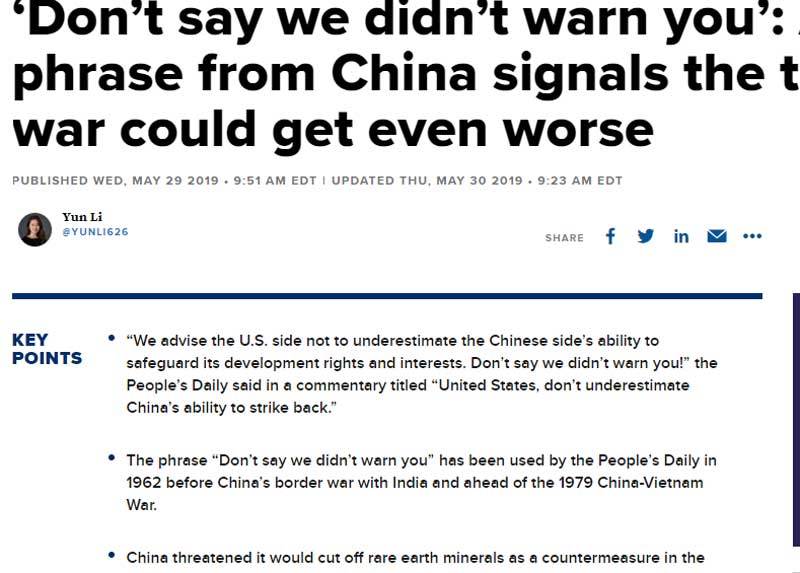 Theo CNBC, tờ People’s Daily hôm 29/5 đã dùng một cụm từ ngữ được coi như một tối hậu thư của nước này: "Đừng bảo là không nói trước" (Don’t say we didn’t warn you) để cảnh báo Mỹ về sức mạnh khó lường của Trung Quốc trong một bài báo nhan đề “Nước Mỹ, đừng đánh giá thấp khả năng phản đòn của Trung Quốc” (United States, don’t underestimate China’s ability to strike back).