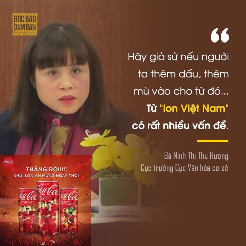 “Cục Văn hóa cơ sở (Bộ Văn hóa – Thể thao – Du lịch) vừa có công văn gửi các địa phương yêu cầu chấn chỉnh hoạt động quảng cáo sản phẩm Coca Cola. Bà Ninh Thị Thu Hương, Cục trưởng Cục Văn hóa cơ sở cho rằng: “Cụm từ “lon Việt Nam” trong cụm từ “Mở lon Việt Nam” là không có nghĩa. Trong tiếng Việt không có từ lon Việt Nam. Chưa kể bản thân chữ lon đặt cạnh cái khác là rất phản cảm và thiếu văn hóa, thiếu thẩm mỹ. Ví dụ như có thể thêm mũ thêm rất nhiều thứ. Nó mà ở các phương tiện quảng cáo ngoài trời, có nhiều tình huống có thể thêm mũ thêm dấu vào từ đó. Vì vậy nó rất là rất khủng khiếp nếu chữ đó nó chềnh ềnh ra trên biển quảng cáo ngoài trời”. (Hết trích).