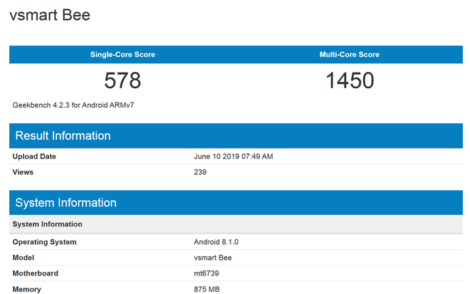 Vsmart Bee cũng đã xuất hiện trên công cụ benchmark Geekbench với thông tin cấu hình trùng khớp. Cụ thể, máy đạt 578 điểm đơn nhân và 1450 điểm đa nhân.