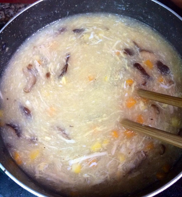 - Bước cuối cùng thành công của món súp này là cách đổ bột năng làm sao sánh ngon không bị loãng quá, đặc quá.