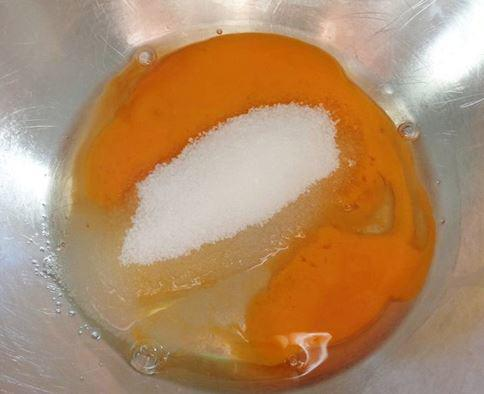 Bước 3: Đập trứng gà vào tô và cho 50g đường còn lại + 2 muỗng canh sữa đặc + 1 muỗng cafe muối rồi dùng cây đánh trứng đánh bông lên đến khi mịn.