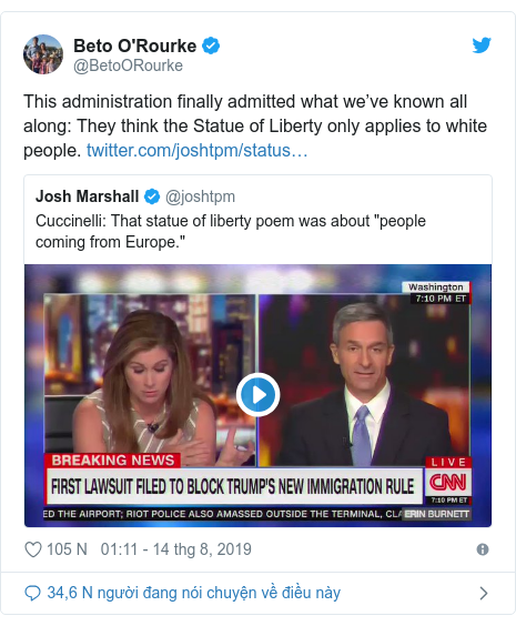 Beto O'Rouke, một ứng cử viên tổng thống đảng Dân chủ từ Texas, chia sẻ một đoạn clip từ cuộc phỏng vấn và cho biết các bình luận cho thấy chính quyền của ông Trump "nghĩ rằng Tượng Nữ thần Tự do chỉ áp dụng cho người da trắng".
