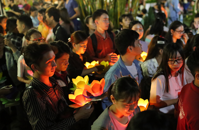 Đông đảo người dân cùng phật tử dự lễ Vu Lan và thả đèn hoa đăng xuống sông Sài Gòn.