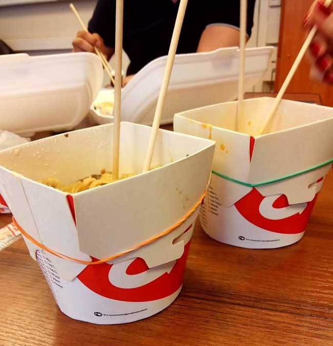 6. Nếu muốn ăn mỳ hộp nhanh gọn mà không bị bắn, hãy dùng dây thun theo cách trong hình