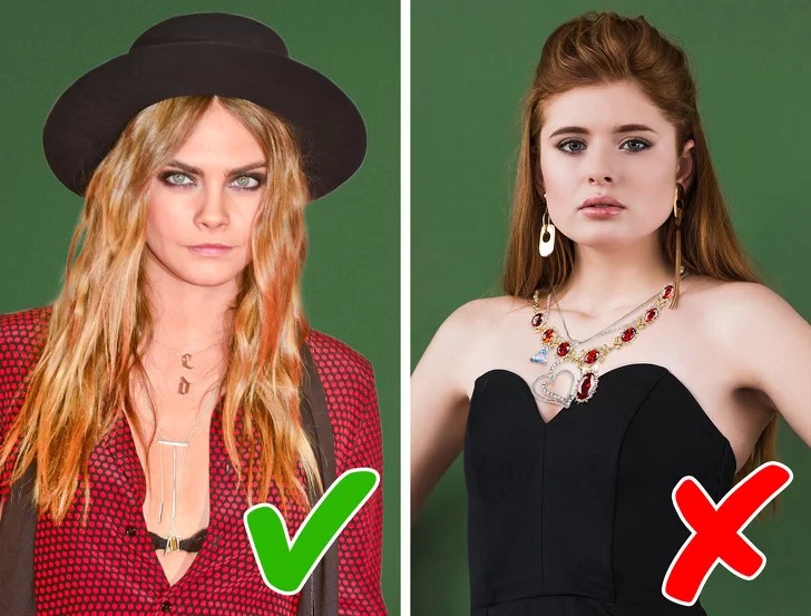 Dây chuyền sẽ giúp bạn hoàn thành diện mạo của mình với những điểm nhấn thú vị. Bạn có thể đeo các lớp các vòng cổ được làm từ cùng một chất liệu. Bạn cũng có thể đeo các loại khác nhau để tạo ra sự tương phản. Điều quan trọng nhất là không lạm dụng và đeo quá nhiều chuỗi vòng khác nhau quanh cổ.