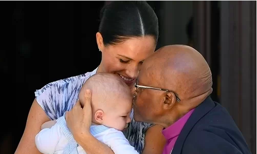Bé Archie ngồi trong lòng mẹ khi Hoàng tử Harry trò chuyện với Tutu, nhà hoạt động Nam Phi 87 tuổi đã thúc đẩy phong trào chống phân biệt chủng tộc và được trao giải Nobel Hòa bình, tại Cape Town. Tổng giám mục Tutu đã hôn lên trán của Archie và chuẩn bị bánh quy có hình trái tim để tặng cậu bé.