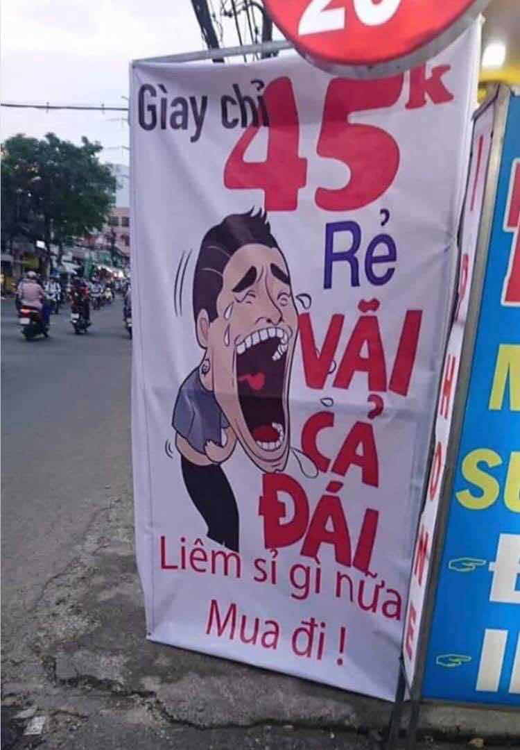 Một đôi giày, giá chỉ 45k (bốn mươi lăm nghìn đồng), đè bẹp cả liêm sỷ và cái sự rẻ mạt khiến người ta coi rằng sự thích thú với (thông tin về mức giá) món đồ sẽ làm họ vãi cả đái ra một cách mất kiểm soát. Họ sẽ vứt đi liêm sỷ để mua ngay nó cho mình.